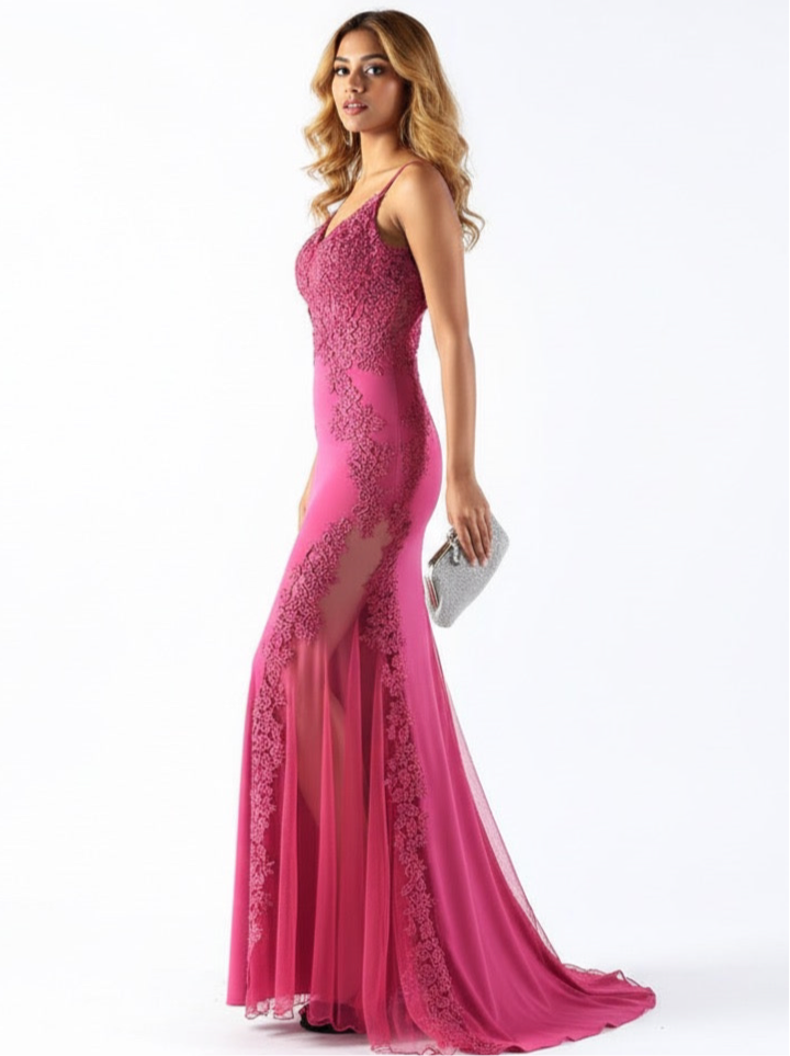 The dress has thin spaghetti straps and a plunging neckline, creating a graceful and feminine look.