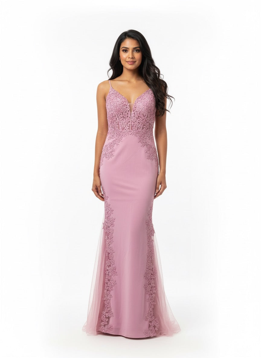 The gown features a fitted silhouette with delicate lace embroidery that runs along the bodice and down the sides, adding a touch of elegance and sophistication.